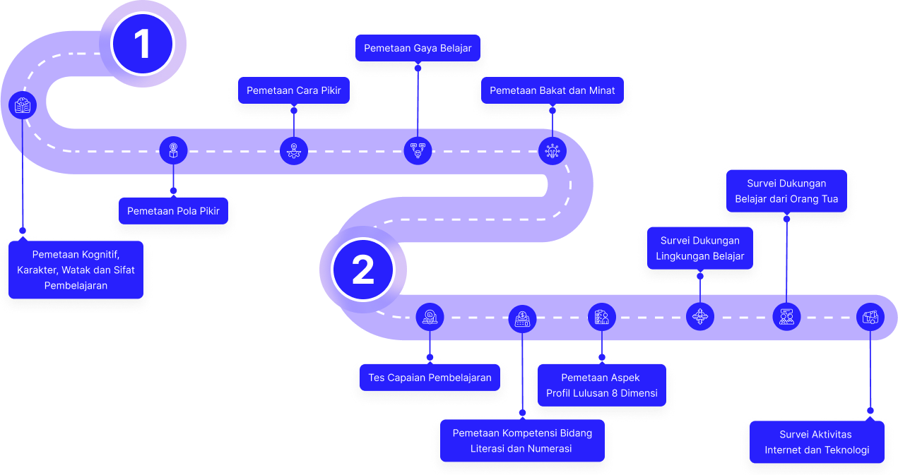 Tes akan dibagi menjadi 2 hari dengan total durasi pengerjaan 6 jam. Tes hari pertama akan difokuskan untuk mengukur kemampuan kognitif dan potensi pembelajaran. Sedangkan hari kedua akan difokuskan pada pemetaan capaian pembelajaran siswa, kemampuan literasi numerasi, gaya belajar, minat bakat, dan profil supporting pembelajaran.