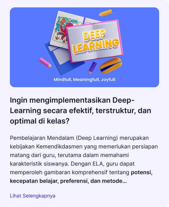 Pembelajaran Mendalam (Deep Learning) merupakan kebijakan Kemendikdasmen yang memerlukan persiapan matang dari guru, terutama dalam memahami karakteristik siswanya. Dengan ELA, guru dapat memperoleh gambaran komprehensif tentang potensi, kecepatan belajar, preferensi, dan metode pembelajaran yang sesuai untuk setiap siswa. Selain itu, ELA juga memberikan analisis kurikulum berbasis Taksonomi Bloom untuk menentukan target pembelajaran yang tepat. Sehingga membantu penyusunan perangkat pembelajaran yang mindful, meaningful, dan joyful untuk melaksanakan pembelajaran mendalam yang efektif di kelas.