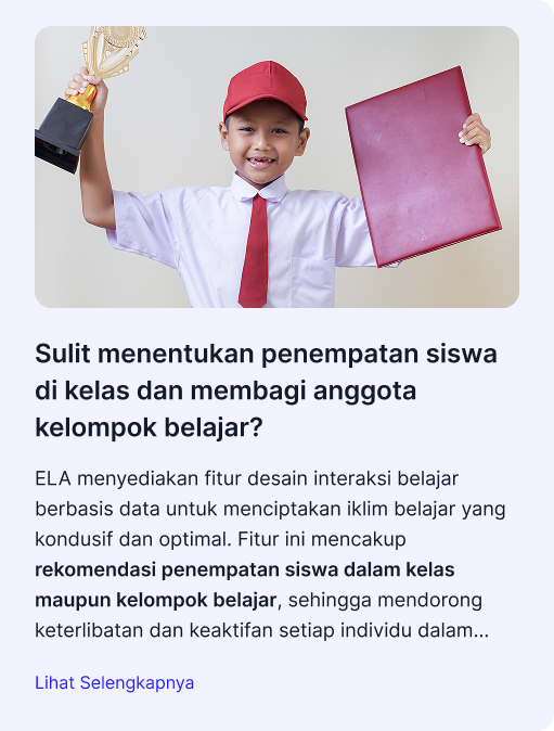 ELA menyediakan fitur desain interaksi belajar berbasis data untuk menciptakan iklim belajar yang kondusif dan optimal. Fitur ini mencakup rekomendasi penempatan siswa dalam kelas maupun kelompok belajar, sehingga mendorong keterlibatan dan keaktifan setiap individu dalam proses pembelajaran di kelas. Selain itu, ELA juga memberikan gambaran lengkap tentang karakteristik kelas dan kelompok, membantu guru memilih perangkat ajar, metode, dan model pembelajaran yang paling tepat.