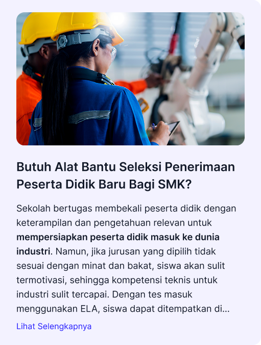 Sekolah bertugas membekali peserta didik dengan keterampilan dan pengetahuan relevan untuk mempersiapkan peserta didik masuk ke dunia industri. Namun, jika jurusan yang dipilih tidak sesuai dengan minat dan bakat, siswa akan sulit termotivasi. Dengan tes masuk menggunakan ELA, siswa dapat ditempatkan di jurusan yang sesuai dengan minat dan bakatnya.